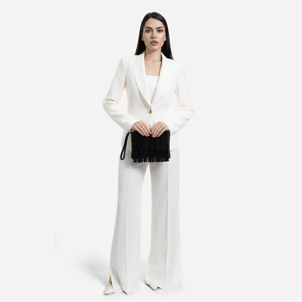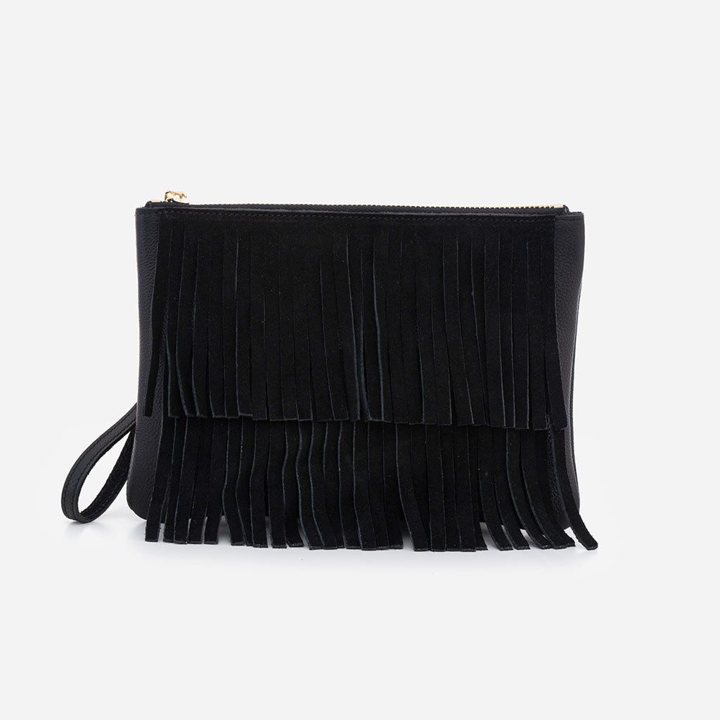 Pouch din piele întoarsă neagră cu franjuri